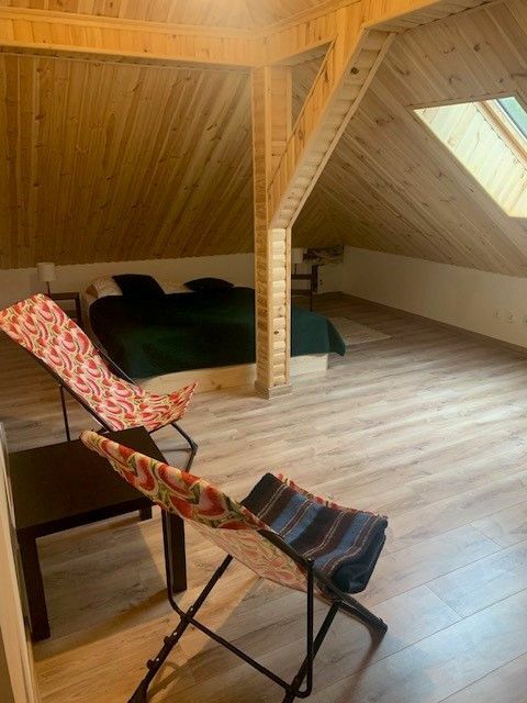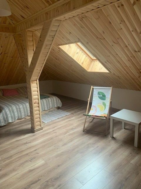 Obie części domu łączy duże pomieszczenie z drewnianymi schodami prowadzącymi na poddasze z osobnym wejściem i wyjściem na taras.