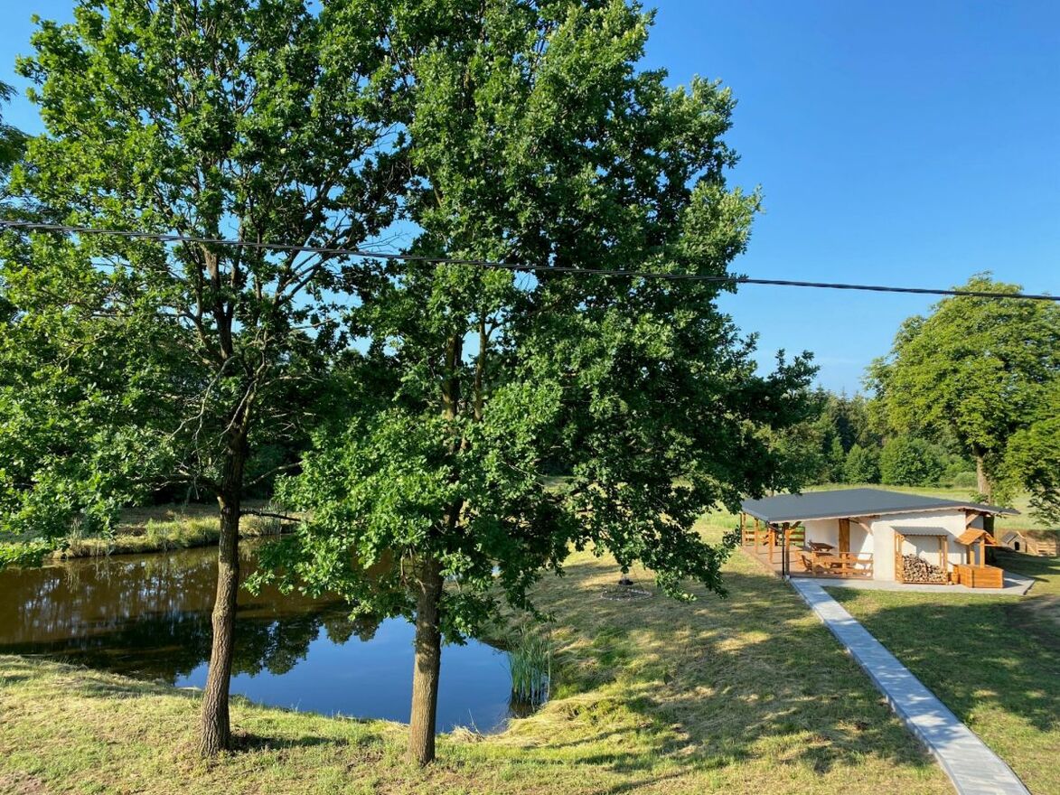 Na działce znajdują się wyremontowane budynki gospodarcze z przestronną wiatą z miejscem i przyłączami do kuchni letniej oraz duży zarybiony staw zasilany przez wody gruntowe.